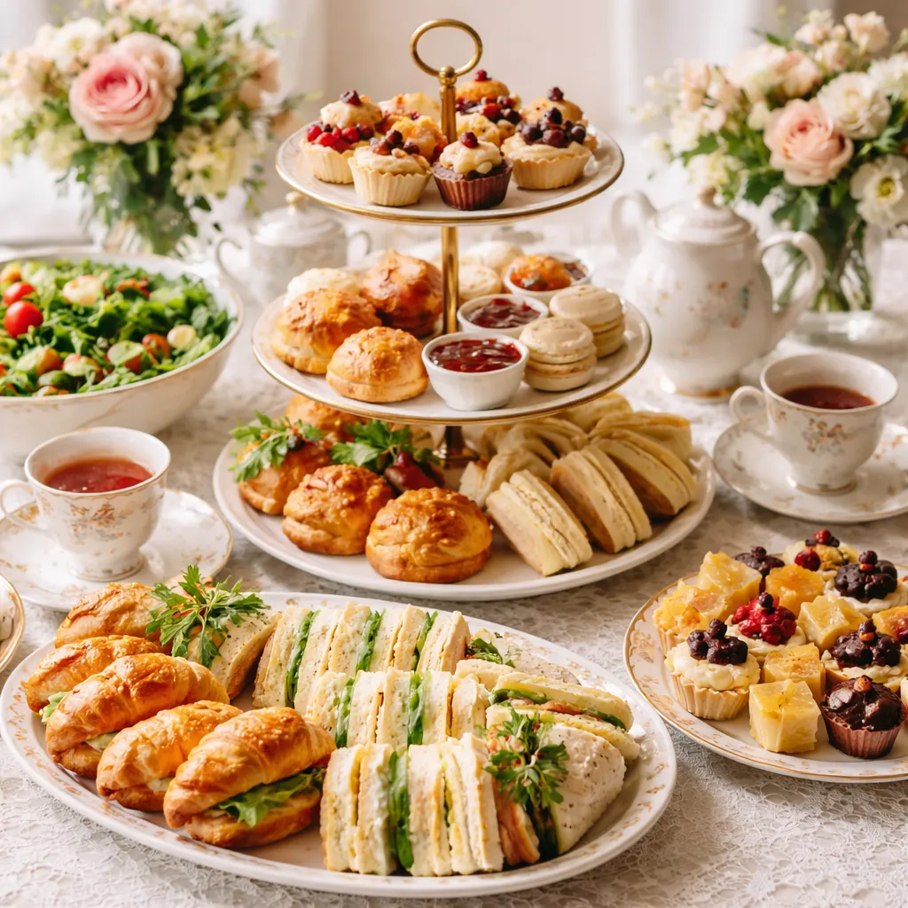 Enjoy a generous selection of heavy hors d’oeuvres thoughtfully prepared for a proper afternoon tea. Guests will be treated to classic favorites such as cucumber sandwiches, turkey sandwiches, fresh salad offerings, traditional scones, muffins, and an assortment of delightful desserts.